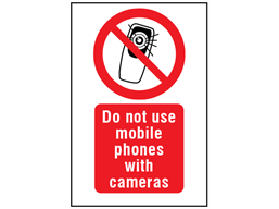 Prohibition safety signs. Do not use mobile phones with cameras. Prohibition safety sign, comply with BS 5378 and Safety signs and signals regulations 1996.