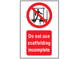 Prohibition safety signs. Do not use scaffolding incomplete. Prohibition safety sign, comply with BS 5378 and Safety signs and signals regulations 1996.