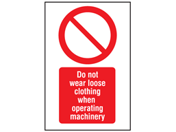 Industrial equipment prohibition safety signs. Do not wear loose clothing when operating machinery symbol and text sign. Prohibition safety sign, comply with ISO EN 7010 and Safety signs and signals regulations 1996.