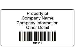 Scanmark+ label with up to 4 lines of custom text (up to 36 characters per line), and consecutive barcode number sequence (code 39). Material self adhesive polyester, with clear laminated surface. Supplied in rolls of 500 labels.