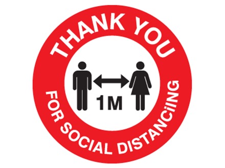 Safety floor markers. Social distance thank you for social distancing one metre (1 metre). Non-slip polycarbonate surface, abrasion, rub and traffic resistant and aggressive adhesive for fitting to sealed floor surfaces.
