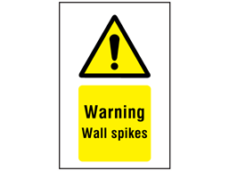 Site security warning signs. Warning wall spikes. Site security warning safety sign, complying with ISO EN 7010 and Safety Signs and Signals Regulations 1996.