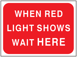 Temporary road traffic signs. When red light shows wait here. Class RA1 reflective surface on zintec steel. Suitable for public highways. Constructed to BS EN 12899-1: 2007 (replacing BS 873), and Traffic Signs Regulations and General Directions 2002, and as amended 2008 and 2011.For use with stanchion frames TRSF1 or TRSF2.